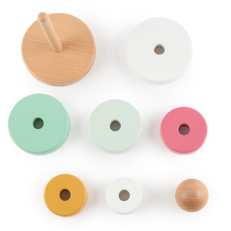 Stacking Tower Berry. The Bieco plug-in pyramid combines childlike design and great colours in Scandi-chic with high-quality wood and is suitable for children aged 12 months and over. When playing with the stacking tower, dexterity and fine motor skills of your child are encouraged. The high-quality wood from the plug-in game feels particularly beautiful in the hands of your little treasure. The 6 rings can be sorted according to size and must be threaded onto the wooden pole. Finally, the ball can be put on the tip of the sorting game. The central wooden pole is firmly connected to the base element, but can be folded. This ensures safety. Combine the stacking tower with the matching wooden motor skills cube or rainbow. The rich colours and cheeky fruits of the Berry colour world give our motor skills classics a cool look and are deliberately designed gender-neutral.