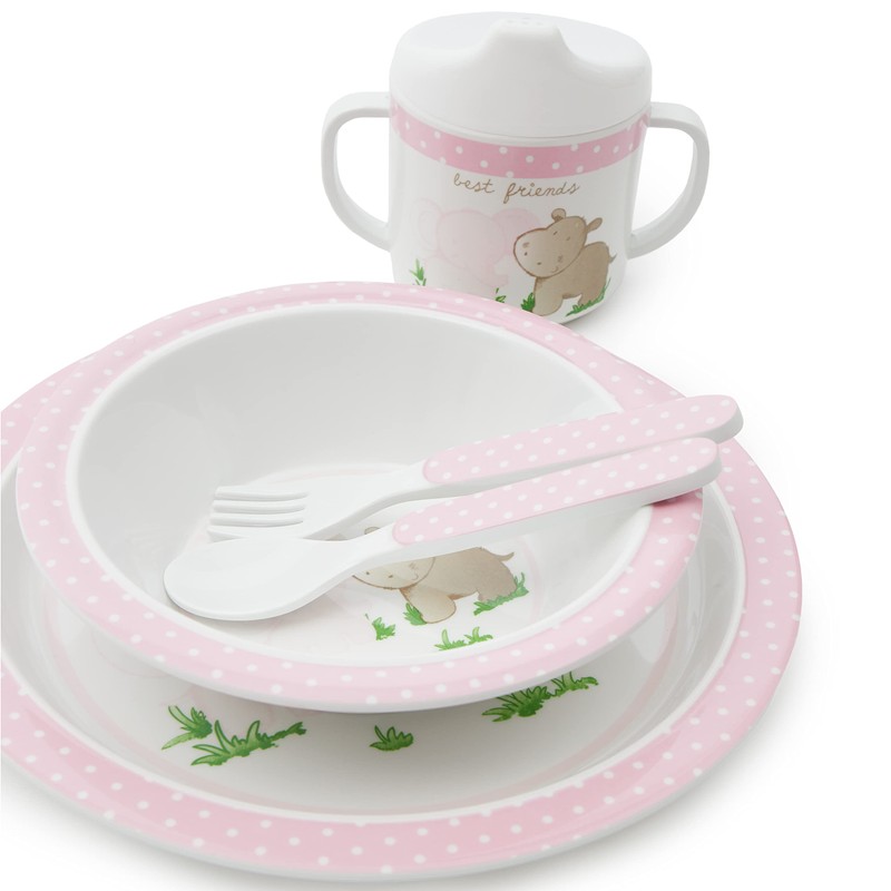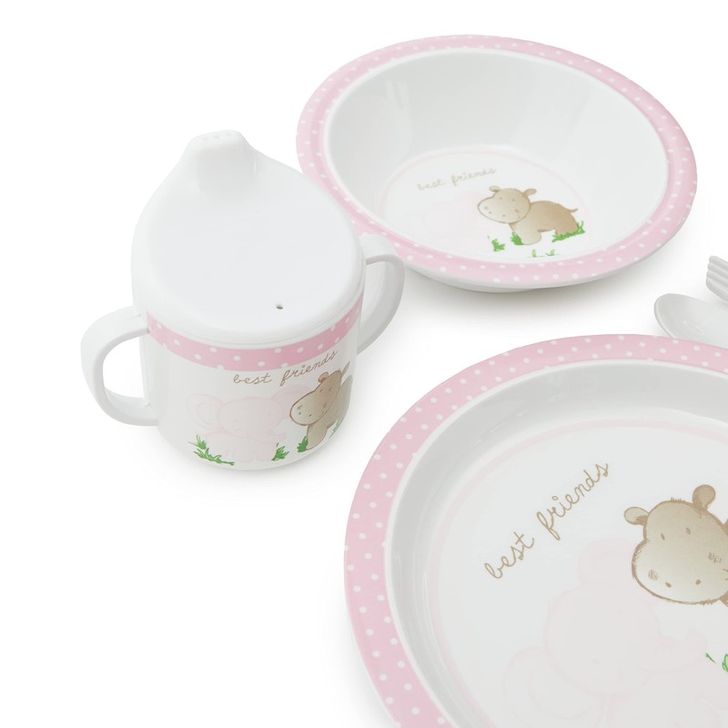 - The 5-piece set consists of plate, cereal bowl, cup, fork and spoon and is decorated with the cute motif Baby Friends (designed by SUPA) in pink, perfect as a cute gift for boys or girls.