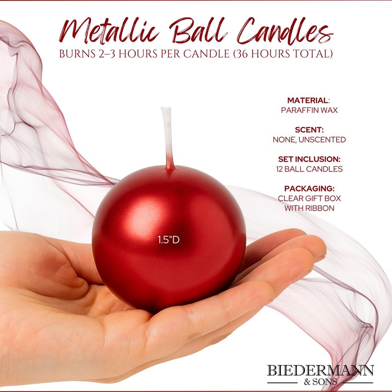 Biedermann & Sons Red Ball Candles – Decorative Metallic Novelty Candles – Set of 12, 1.5-Inch