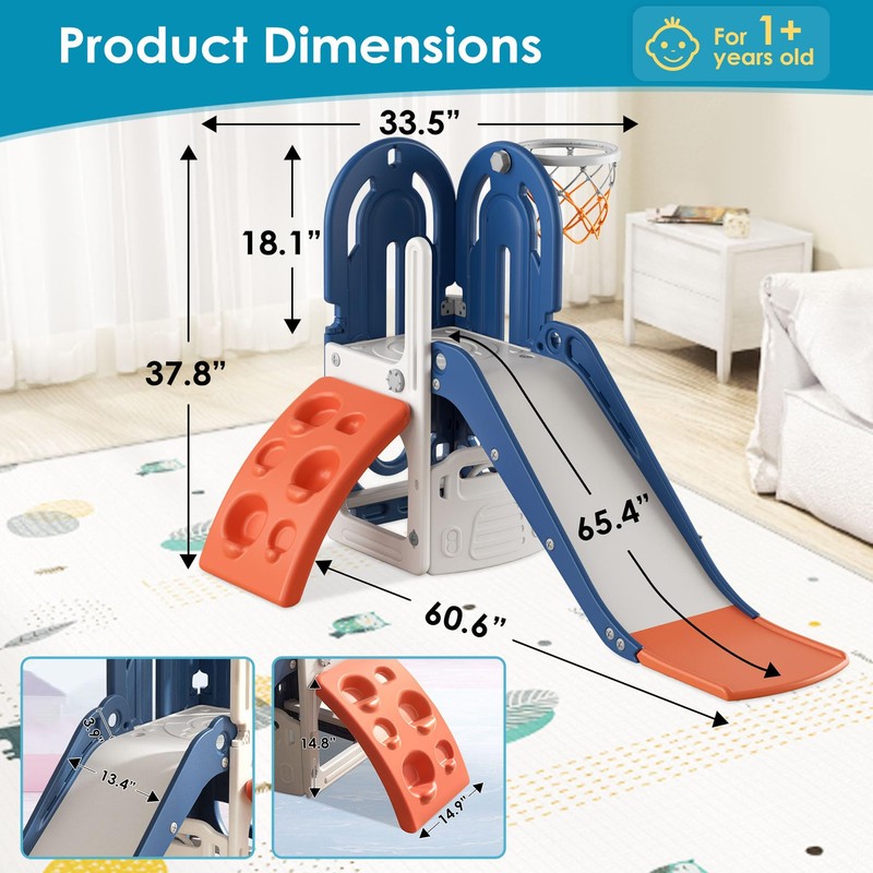 - 🏀 4 in 1 ACTIVITY CENTER - Indoor Baby Slide has 4 activity areas, including climbing area, slide, shoot a basket area and storage space. By climbing, shooting basketball and sliding, babies develop coordination and a sense of adventure through play.