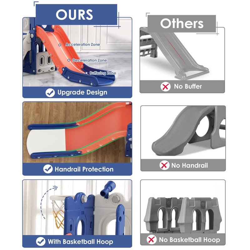 - 7 in 1 Toddler Playground - Baby Slide has 6 activity areas, plus a storage space, including stairs, slide, shoot a basket area, hide and seek area, telescope and ring toss. By climbing, shooting basketball and sliding, helps children develop motor skills, balance, and coordination.