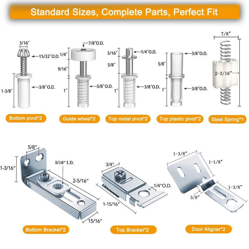 - 【PACKAGE INCLUDE】: 4 Sets Bifold door repair hardware kit includes 4 x 3/8" top metal pivots, 4 x 3/8" top plastic pivots, 4 x 7/8" plastic guide wheels, 4 top pivot brackets, 2 steel spring, 4 door aligner , 4 x 3/8" bottom pivots, 4 x 3/8" bottom pivot brackets, 24 screwss. Closet door hardware kits can quickly and easily repair doors weighing up to 50 lbs. and with thicknesses ranging from 1" to 1-3/8", suitable for 7/8"-1" wide track. (Please note: Track and hinges are not included.)