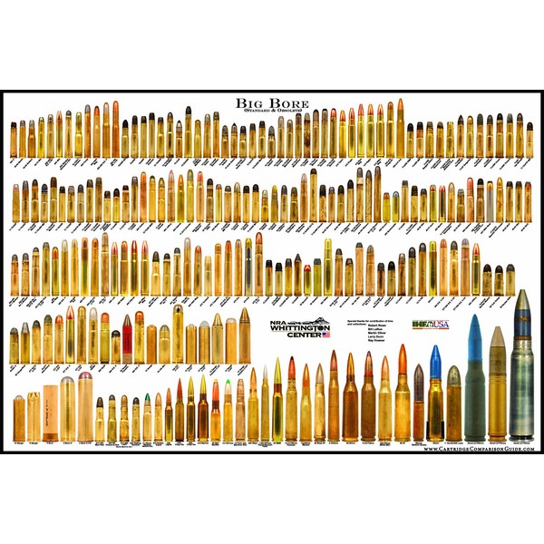 It includes historically significant cartridges from the late 1800s such as paper patched: Sharps, Peabody, Winchester, Nitro Express, Westley Richards, Schutzen, Grundig, and Werndl rounds. As well as military cartridges circa WWI & WWII such as the 577-450 Martini-Henry, Maxim Machine Gun, 450 Gatling, 50 Breda, Maxim Balloon Buster, 55 Boys AT, .5 Vickers, 7.9 PanzerBausch, etc. The poster gathers influential rounds up to the current day. These include cartridges such as the 416 Ruger and 416 Weatherby Magnums, 458 Socom, 458 Lott, 460 Weatherby, 505 Gibbs, 500 Jeffery, and the 577, 600, and 700 Nitro Express cartridges. The poster also includes significant long distance and Anti-Material cartridges such as the 375 & 408 Chey-Tac, 416 Barrett, 460 Steyr, 50 BMG, 50-20, 20mm, 25mm, 30mm.