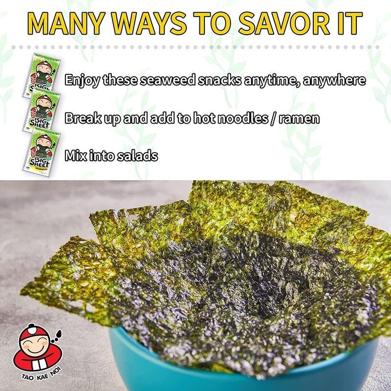 - SNACK ON-THE-GO Whether you go to school or to work, bring your snack along for the ride! Tao Kae Noi big grilled seaweed sheets are a fun, tasty treat to look forward to during the day. For convenience, our seaweed sheets are individually wrapped so that every sheet is kept at its peak flavor and crispness when it's time to dig in!