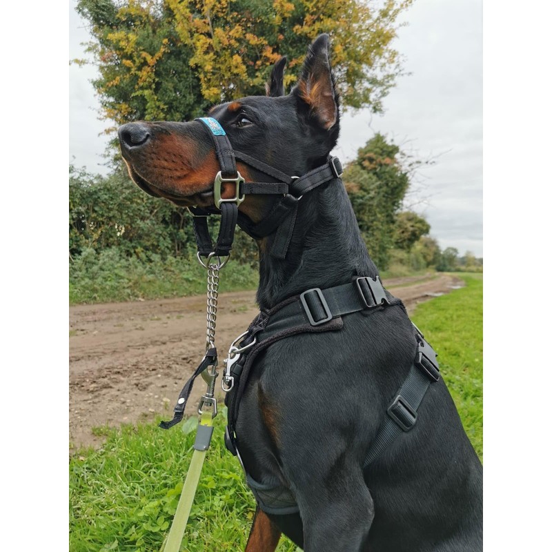 Handmade in the UK from extremely strong padded webbing and lined with wet suite quality neoprene, for comfort and to stop chaffing and fur loss. They have high quality stainless steel fittings and a 4mm thick martingale chain where the lead connects to the collar, this stops your dog chewing through the base of the head collar. The loop under the chin gently closes around your dogs muzzle when they pull, allowing the handler to have total control over the dogs head and therefore the direction they go.