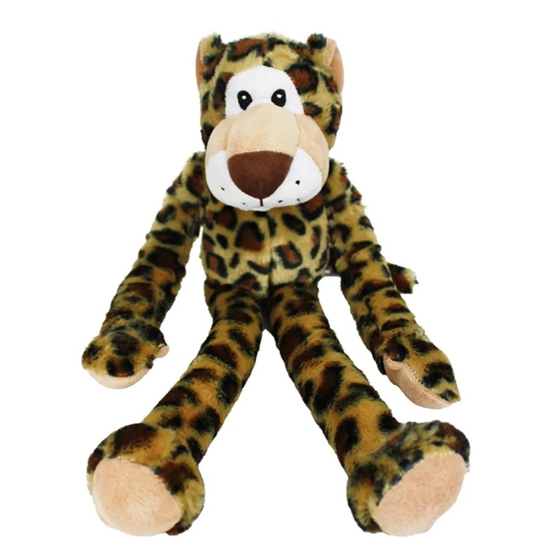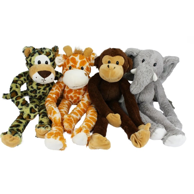 It's a jungle out there! These 19 inch, larger dog toys are the plush, animal-themed pals every pet needs in their dog toy bin. They have extra long arms and squeak when squeezed! Soft plush stuffed toys are not designed for aggressive chewers. They hug, cuddle, play and squeak for hours of fun. Also great for small breed sleep time. Squeakers to excite and entice dogs Great for interactive play and fetch Extra long arms for tug of war play Material: Polyester 55%, pp cotton filling 40.5%, squeaker 4.5% Size: 19"