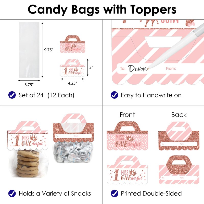 - 1st Birthday Little Miss Onederful Candy Bags with Toppers includes set of 24 clear favor bags with DIY favor bag labels. Candy bag topper labels comes with a to and from section that is easy to handwrite names for easy gift-giving.