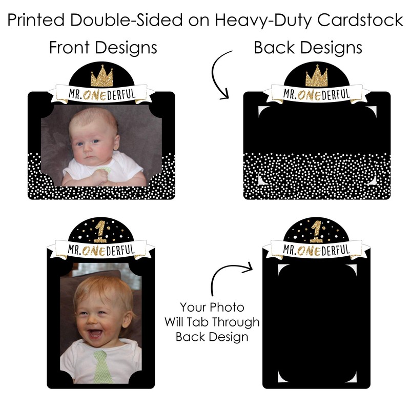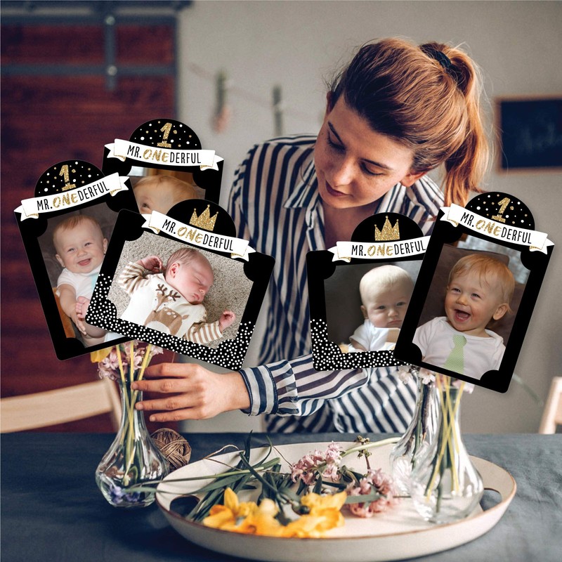 - 1st Birthday Little Mr. Onederful Photo Table Toppers INCLUDE 15 sturdy and professionally printed paper photo holders and 15 wooden dowel sticks. Each photo holder has pre-cut tabs to display your 4x6 photos vertically or horizontally. Clear stickers are included to easily assemble the dowel to photo holder.