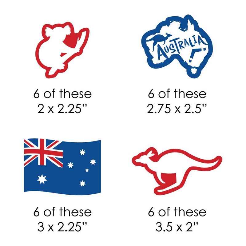 - Australian Straw Decor party kit SIZE 6 Koala paper die cuts (2” x 2.25”), 6 Australia paper die cuts (2.75” x 2.55”); 6 Flag paper die cuts (3” x 2.25”), 6 Kangaroo paper die cuts (3.5” x 2”) and 25 chevron striped paper straws 7.75" tall.