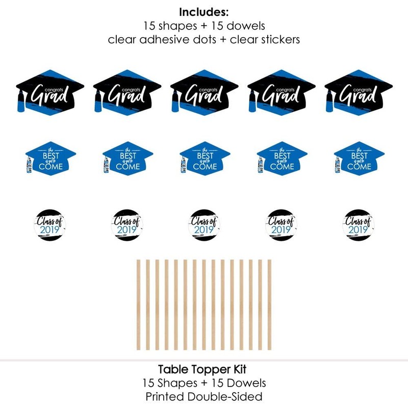 - EASY PARTY DECOR: Blue Grad - Best is Yet to Come table decorations can be used as centerpieces when attached to the included dowels and inserted into vases or floral arrangements. They easily accent your graduation candy buffet when you add them to apothecary jars. Table toppers are also a great addition to any photo booth. The large shaped cut outs will make your party pics instantly shareable. Royal blue and black centerpiece sticks are sure to make a statement however you choose to use them!