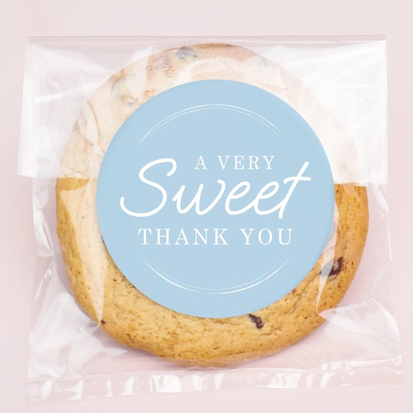 - Cellophane Treat Bags: Dusty Blue Simple Script Wedding Thank You Clear Cookie Bags are the sweet finishing touch to any party treat! Each set includes 25 clear cellophane treat bags (4.25 inches x 7 inches) and 30 round 3-inch stickers. Fill them up, fold over the top, and seal with a sticker. Easy, fun, and effortlessly cute!