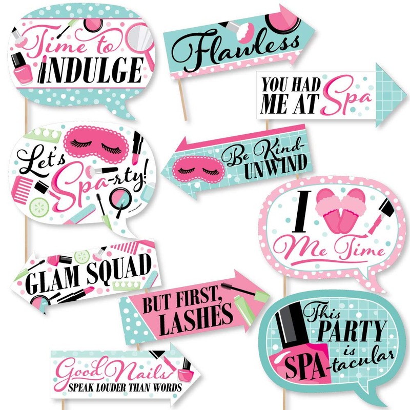 - 10-Piece Funny Spa Day Photo Booth Props Kit INCLUDES 10 cosmetic arrow and speech bubble photo booth props, 10 wooden dowel sticks and stickers for assembly. EASY ASSEMBLY: Simply attach the printed DIY photo booth props to the wooden dowels with included reinforcing stickers.