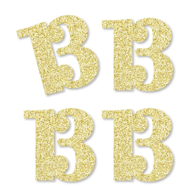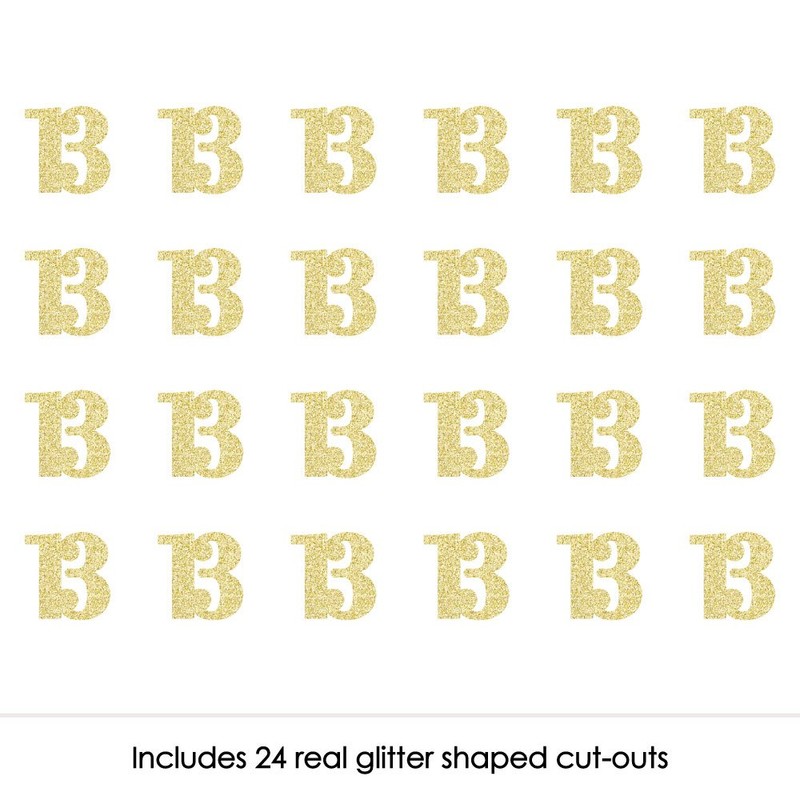 - Gold Glitter Number 13 Confetti INCLUDES 24 no-mess real gold glitter cut-out number 13s for a birthday party. Number 13 gold confetti is cut from no-mess glitter paper, making them perfect for table decorations and ensuring easy clean up.