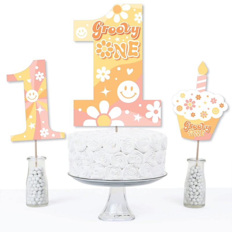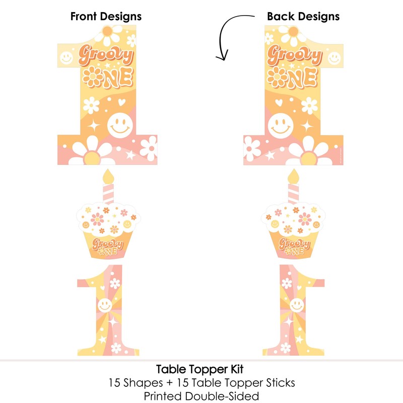 - EASY PARTY DECOR: Groovy One table decorations can be used as centerpieces when attached to the included centerpiece sticks and inserted into vases or floral arrangements. They easily accent your first birthday party candy buffet when you add them to apothecary jars. Table toppers are also a great addition to any photo booth. The large shaped cut outs will make your party pics instantly shareable.