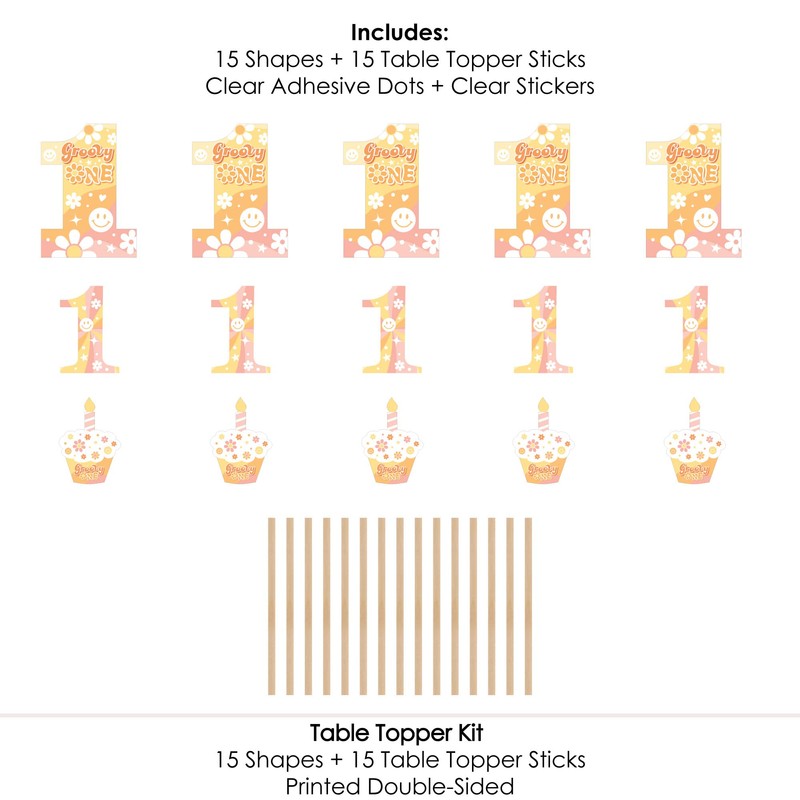 - Groovy One Centerpiece Sticks INCLUDES 15 Groovy One table toppers in three different shapes, 15 centerpiece sticks and stickers for easy assembly. Boho hippie party table decorations are perfect for a first birthday party.