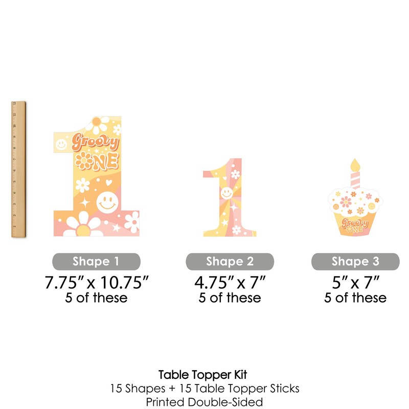 - Groovy One Centerpiece Sticks SIZE five shape 1 table toppers, 7.75” wide x 10.75” tall; five shape 2 table toppers, 4.75” wide x 7”: tall; and five shape 3 table toppers, 5” wide x 7” tall. The unique design and variety of pieces makes this table decoration kit an impressive addition to any boho hippie theme party.