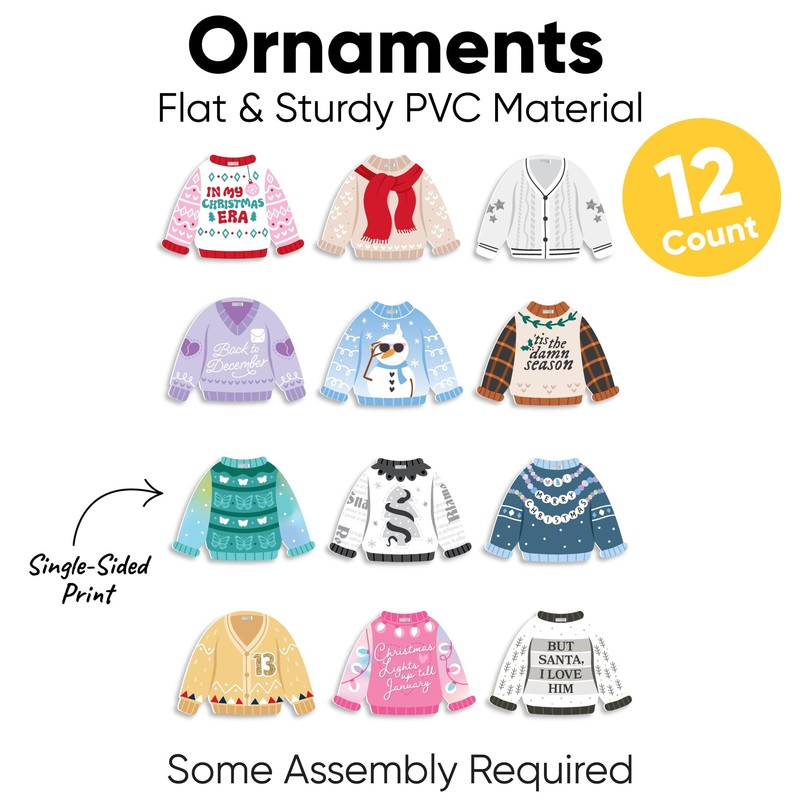 - Christmas Era Designs: Each of the 12 ornaments is shaped like a cozy sweater, with designs representing all of the iconic albums —from Back to December vibes to Red scarf moments. A must-have for every true Swiftie looking to decorate the holidays with a pop culture twist!