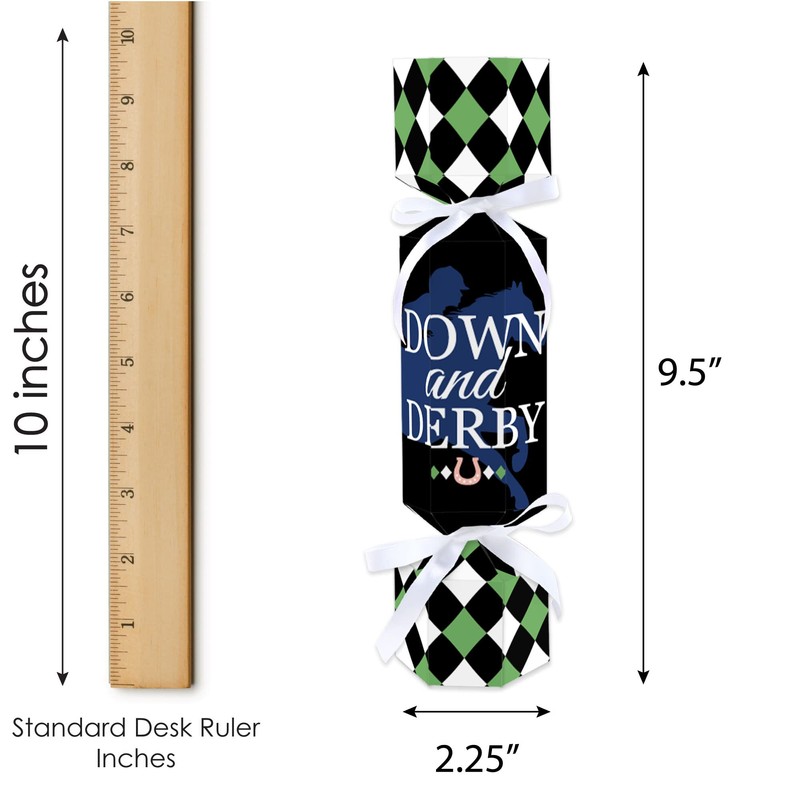 - High-Quality Supply: Kentucky Horse Derby crackers are professionally printed double-sided on heavy-duty cardstock paper with a photo-like shine. When assembled, Kentucky Horse Derby party crackers measure 2.25” wide by 9” tall. Cracker favor boxes will arrive flat with some assembly required. Candy not included.