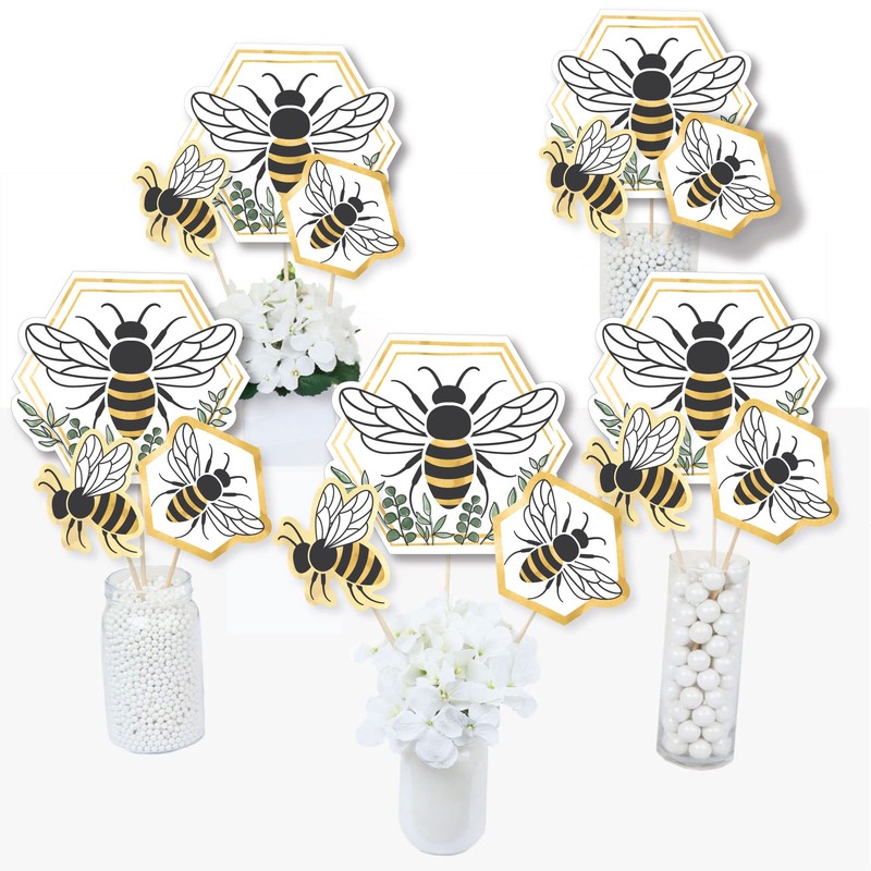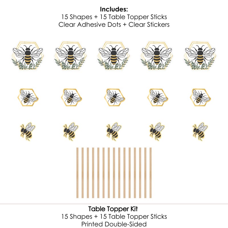 • Little Bumblebee Centerpiece Sticks INCLUDES 15 bee table toppers in three different shapes, 15 table topper sticks and stickers for easy assembly. Honey bee party table decorations are perfect for a baby shower or birthday party.