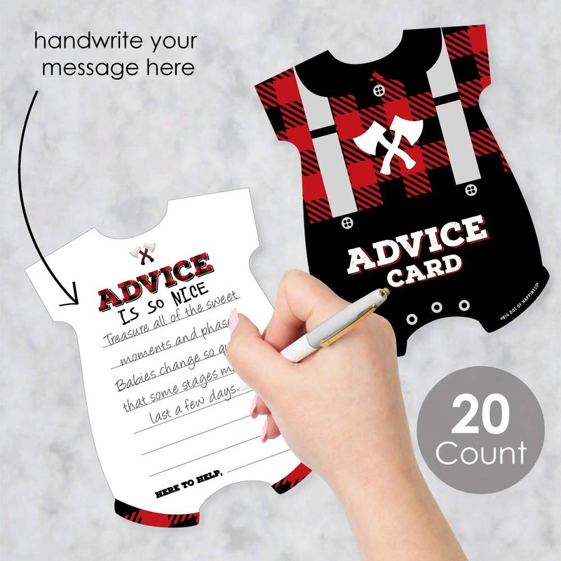 - Lumberjack - Channel the Flannel Shaped Baby Shower Advice Cards INCLUDES 20 cards with space for writing advice or words of wisdom to the expecting parents.