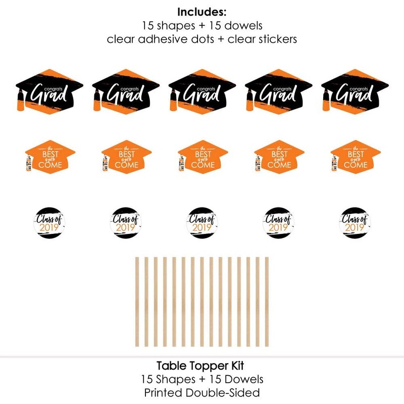 - EASY PARTY DECOR: Orange Grad - Best is Yet to Come table decorations can be used as centerpieces when attached to the included dowels and inserted into vases or floral arrangements. They easily accent your graduation candy buffet when you add them to apothecary jars. Table toppers are also a great addition to any photo booth. The large shaped cut outs will make your party pics instantly shareable. Orange and black centerpiece sticks are sure to make a statement however you choose to use them!