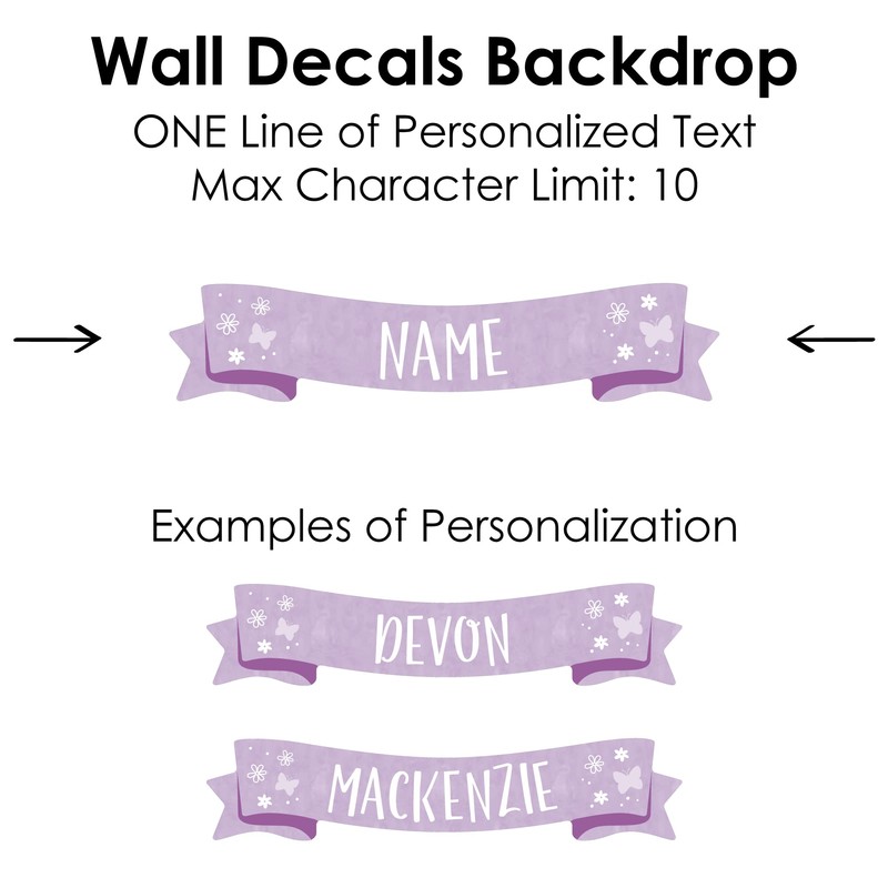 - Custom Beautiful Butterfly Wall Decals Backdrop includes 1 sheet of vinyl wall stickers that include letters and shape pieces that form the perfect custom name backdrop for your Floral Birthday Party. Wall Decal sheet measures 50 inches wide by 16.5 inches tall. Pieces range in size from 26.5 x 5.75 inches to 3 x 2.5 inches.