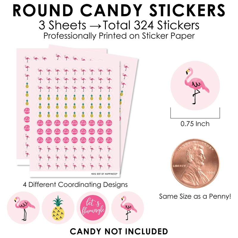 - Pink Flamingo - Party Like a Pineapple Small Round Candy Sticker Favors includes 3 sheets of 108 stickers per sheet for a total of 324 stickers - perfect for styling your Tropical Summer Party candy favors. Measuring to 0.75 inches in diameter, these round candy labels will fit a variety of small candies with a flat, round bottom like wrapped chocolate or peppermints. Candy not included.