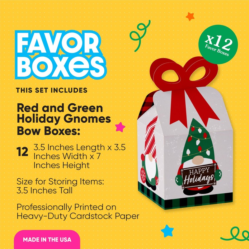 • Bow Boxes INCLUDE: 12 Red and Green Holiday Gnomes-themed square favor gift boxes. Each box SIZE measures 3.5 inches length x 3.5 inches width x 7 inches height. Bow boxes are ideal for small gifts and treats that are under 3.5 inches tall (height for storing items in closed box). When assembled and closed, each box creates a 3D paper bow-shaped top with a square bottom.