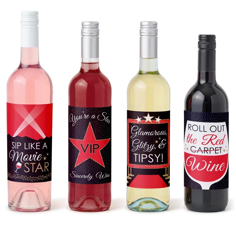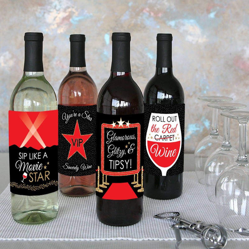 - Red Carpet Hollywood Wine Bottle Gift Set INCLUDES Set of 4 movie night wine bottle sticker labels in the Hollywood theme.