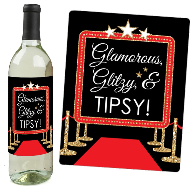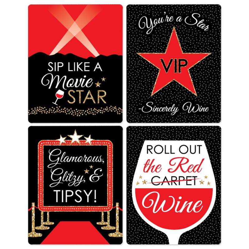 - Red Carpet Hollywood Wine Bottle Gift Set INCLUDES Set of 4 movie night wine bottle sticker labels in the Hollywood theme.