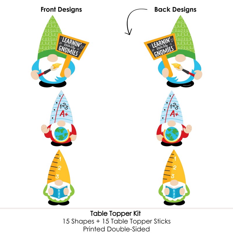 - School Gnomes Centerpiece Sticks INCLUDES 15 gnome table toppers in three different shapes, 15 table topper sticks and stickers for easy assembly. Gnome table decorations are perfect for a teacher or classroom event.