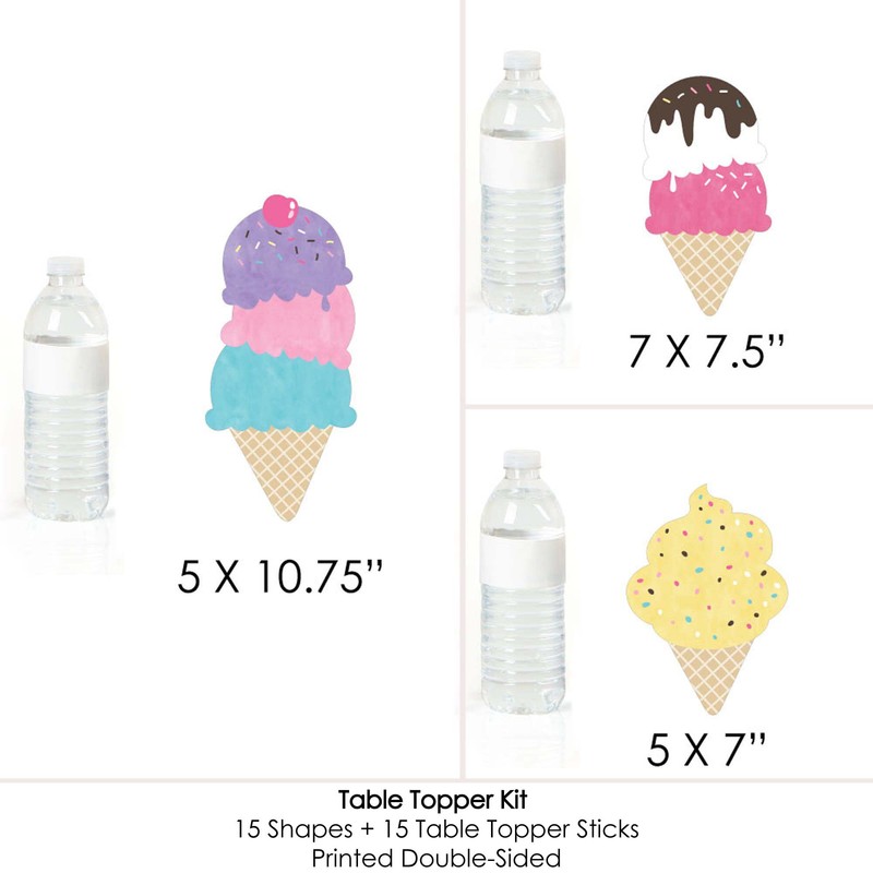- Scoop Up The Fun - Ice Cream Centerpiece Sticks INCLUDES 15 ice cream cone table toppers in three different shapes, 15 table topper sticks and stickers for easy assembly. Ice cream cone party table decorations are perfect for a sprinkles party.