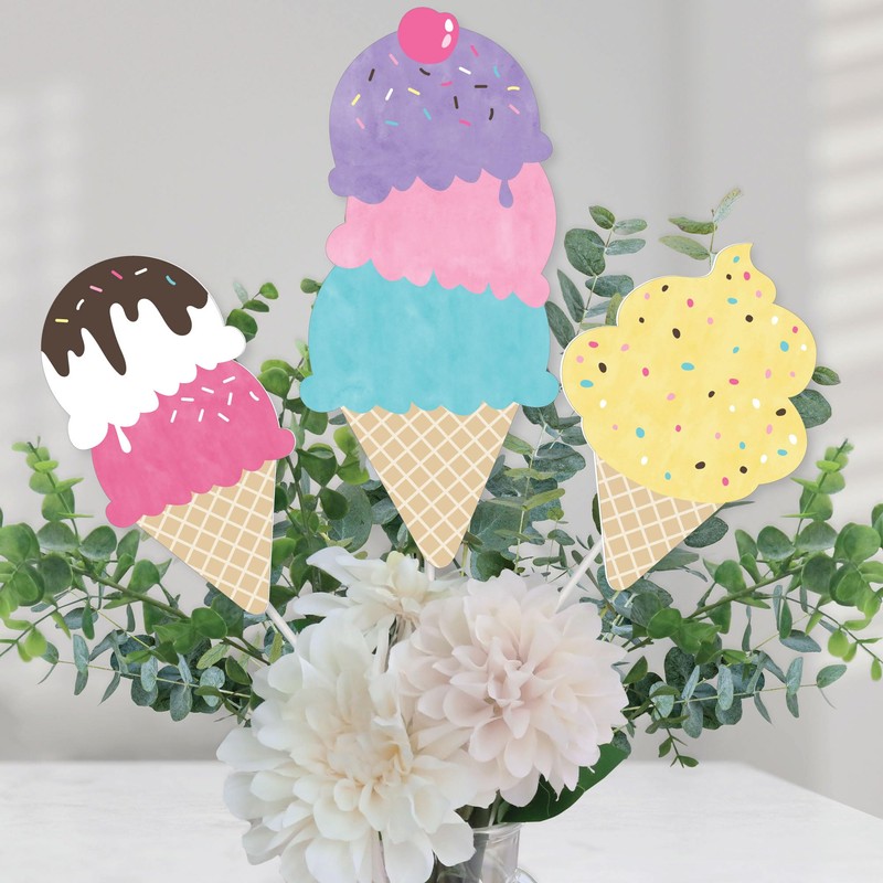 - EASY PARTY DECOR: Scoop Up The Fun - Ice Cream table decorations can be used as centerpieces when attached to the included table topper sticks and inserted into vases or floral arrangements. They easily accent your sprinkles party candy buffet when you add them to apothecary jars. Table toppers are also a great addition to any photo booth. The large shaped cut outs will make your party pics instantly shareable.