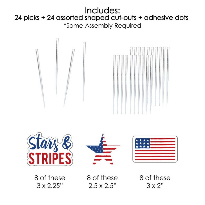 - Stars & Stripes Dessert Cupcake Toppers INCLUDES 24 clear treat picks, 24 shaped paper cut outs and stickers for easy assembly. DIY Stars & Stripes cupcake supplies are perfect for a Patriotic party.