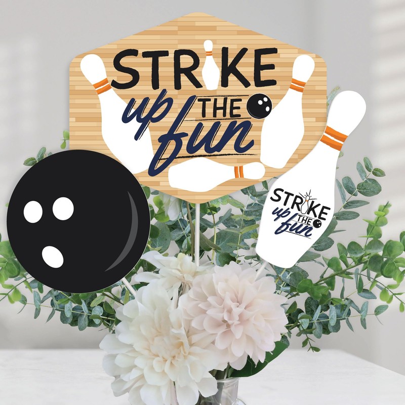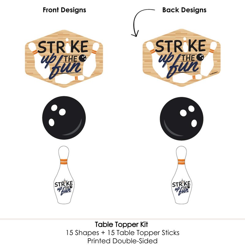 - Strike Up The Fun - Bowling Centerpiece Sticks INCLUDES 15 Strike Up The Fun - Bowling table toppers in three different shapes, 15 table topper sticks and stickers for easy assembly. Bowling party table decorations are perfect for a baby shower or birthday party.