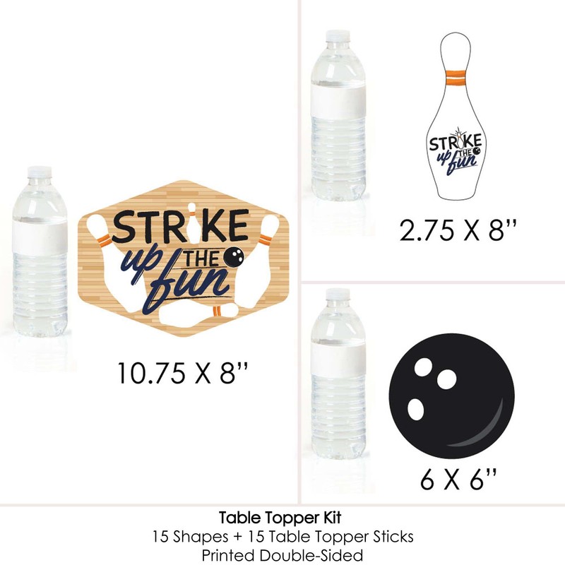 - Strike Up The Fun - Bowling Party Centerpiece Sticks SIZE five strike up the fun table toppers, 10.75” wide x 8” tall; five pin table toppers, 2.75” wide x 8” tall; and five bowling ball table toppers, 6” wide x 6” tall. The unique design and variety of pieces makes this table decoration kit an impressive addition to any bowling theme party.