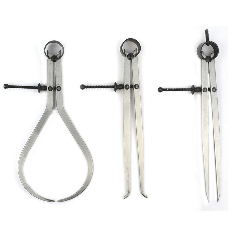 Stainless steel with hardened fulcrum spring and points for long life. Precision ground with threaded spool mechanism for infinite adjustment. Includes 8-Inch Outside Caliper, 8-Inch Inside Caliper, and 8-Inch Divider.