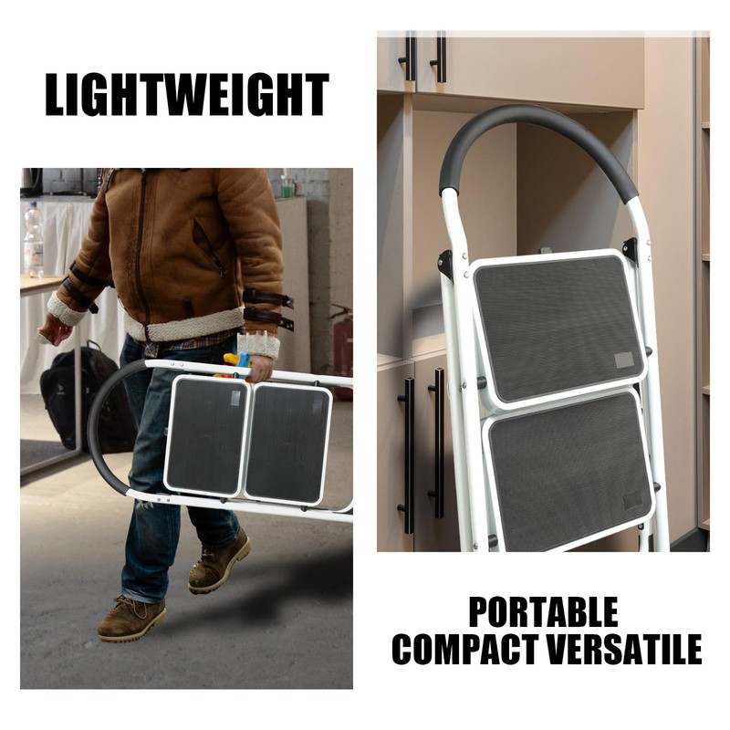 - QUALITY WEIGHT-BEARING: The 2 Step Ladder features a high-strength steel frame that is sturdy and reliable. It can hold up to 400 pounds. The Safety folding 2-step steel ladder designed just for you