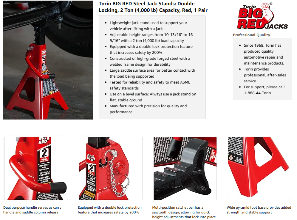 The Torin BIG RED T42002A steel double locking jack stands are a must have necessity in any garage. Handles a wide range of vehicles including small cars,ATV's, UTV's, and more. It's constructed of high-grade steel with a welded frame for quality and long term durability. Features a lifting range of 10-13/16" to 16-9/16" with a 2 ton (4,000 lb) load capacity. Each stand is equipped with a removable locking support pin designed and dedicated to keeping you safe and increases safety by 200%. Multi-position forged iron ratchet bar has a sawtooth design, allowing for quick height adjustments that lock into place. The saddle has a large surface area that provides better contact with the load being supported. Wide pyramid style foot base provides added strength; Large foot base delivers additional stability and measures 7-11/16" x 6-7/8". Meets ASME safety standards and includes a limited 1 year manufacturer warranty.