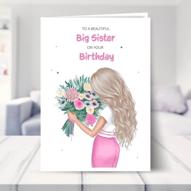Big Sister Birthday Card - Beautiful Blonde Big Sister with Flowers - Beautiful Card with Lovely Words for 20th, 30th, 40th, Milestone Bdays