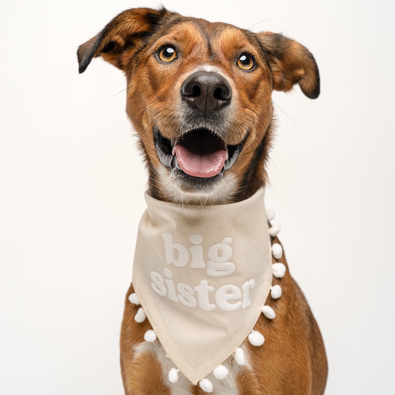 Big Sister Puff Printed Dog Bandana |Pom Poms | 100% Unbleached Cotton Adjustable Triangle | Pregnancy Announcement Photoshoot Prop | New Baby | Gender Reveal |Natural, Trim 3 (1304)