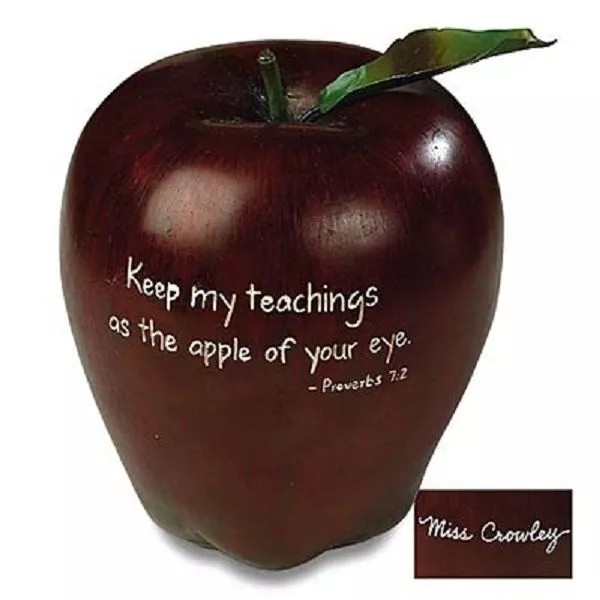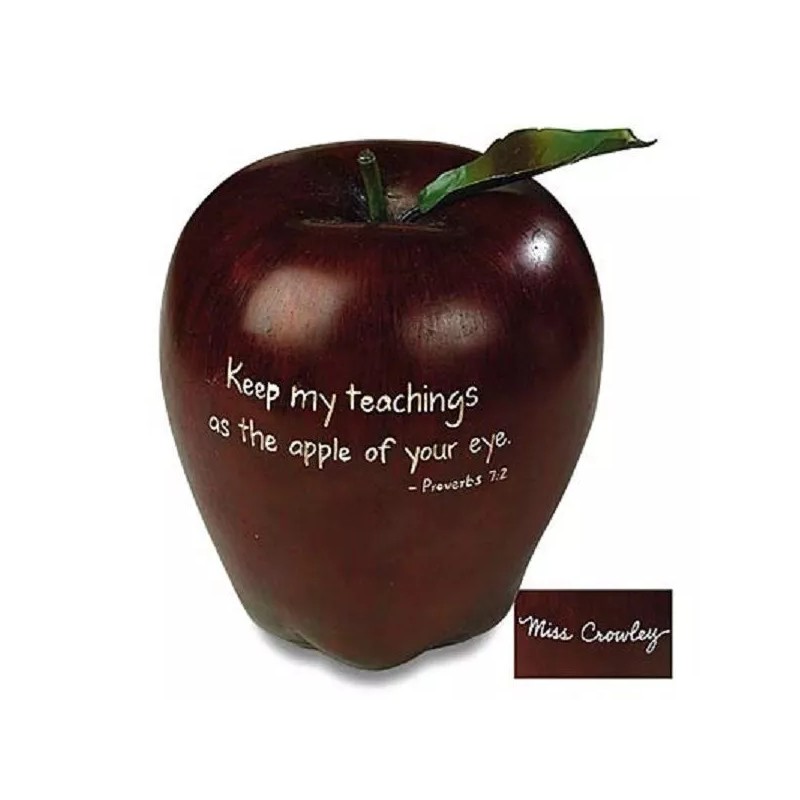 An apple for teacher's desk. The classic classroom gift gets a makeover! Realistic apple is crafted of resin, painted and adorned with a metal stem and leaf. Scripture is etched on one side. Measures 4 1/2" x 4 3/4". Sorry, this item cannot be personalized.