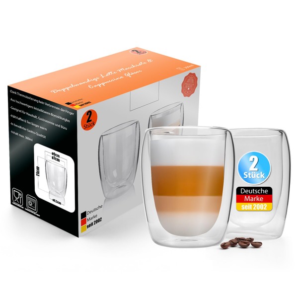 - Excellent heat insulation: our double-walled glasses set keeps hot drinks such as latte macchiato, cappuccino or tea warm for longer without the outside getting hot. Each glass is lovingly handmade from high-quality and crystal clear borosilicate glass.