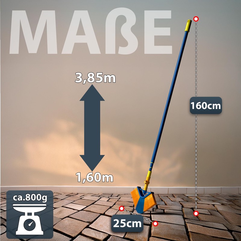 - Sturdy construction in professional quality - 2 telescopic steps ensure high stability, perfect as a telescopic broom - 5 metres working height for regular cleaning.