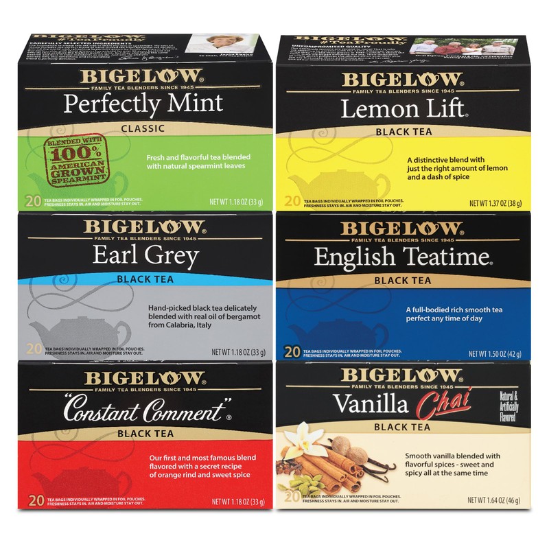 - Black Tea Variety: 120 black tea bag variety pack of Bigelow Perfectly Mint, Lemon Lift, Earl Grey, English Teatime, Constant Comment, Vanilla Chai caffeinated teas