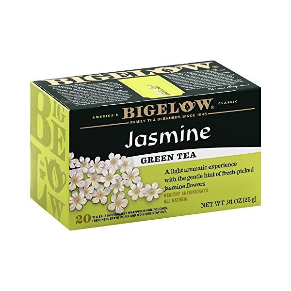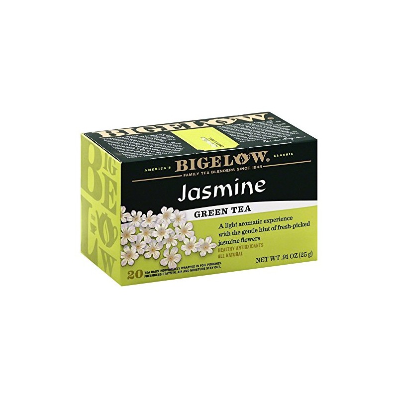 - Smooth, flavorful Green Tea with a gentle hint of Jasmine. Fusing the finest hand-picked teas from the high-elevation gardens with gentle, floral tones of Jasmine, this tea has captured the flavor of the Far East. Linger over a cup just once and you'll know that Bigelow Jasmine Green Tea, rich in antioxidants with less caffeine than black tea, is like no other.