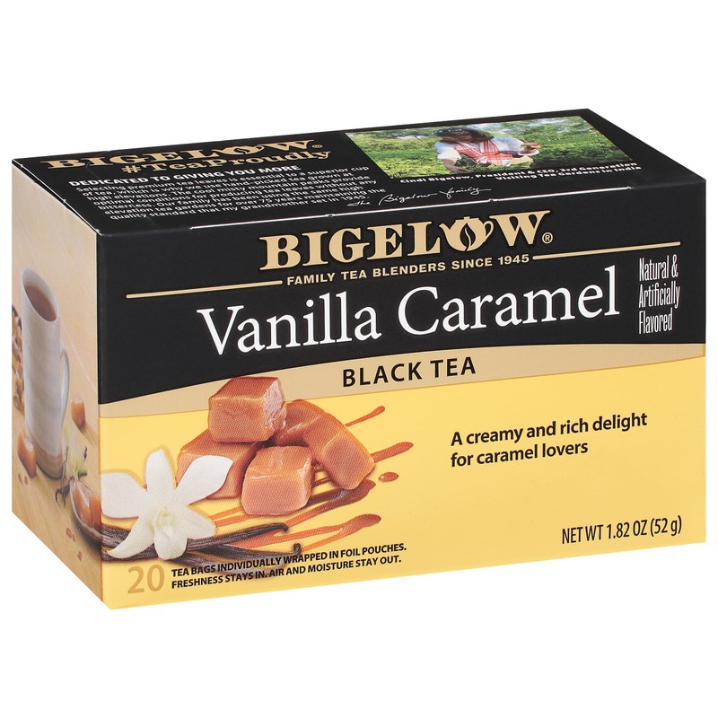 Product Description Individual fresh pack. Natural and artificially flavored. A distinctive taste in tea with a rich and robust vanilla caramel flavor. Milk and sweetener round out the delicious flavors. Each tea bag is individually sealed in an airtight packet. Each tea bag individually wrapped to ensure your full enjoyment. Experience more than just a tea. How can something so incredibly delicious have no calories and be good for you too? It's true! Bigelow Vanilla Caramel tea has the rich, creamy flavor of caramel yet contains no calories. And because this delicious blend contains black tea, it has the added benefit of healthy antioxidants. When you feel you need a moment for yourself, relax with its wonderful aroma and unforgettable taste. Or, use it in place of high calorie desserts, since its natural sweetness will satisfy even the most demanding sweet tooth. Great taste, no calories and healthy antioxidants- amazing but true. Bigelow Vanilla Caramel Tea - a sure way to please your senses and enchant your taste buds. Blended and packaged in the U.S.A. About the Brand The Bigelow® Tea Story Beginning the moment our founder, Ruth Campbell Bigelow created "Constant Comment"® Tea in her kitchen in 1945, our family has focused on just one thing trying to make the finest teas possible. Over the years we have introduced many new flavors as well as concepts in tea. Today we offer a selection of deliciously different blends of teas and green teas, a wide variety of herbal teas and teas flavored with real fruit juice. Today Bigelow Tea is the number one specialty tea company in the United States. And to think it all began with the first legendary black tea flavored with golden orange rind and sweet spice "Constant Comment"®Tea. Bigelow takes immense pride in providing the tea drinking community with the best tea at a great value. We only use hand- picked teas, real spices, flavors and herbs. The flavors and blends we have created are second to none. Some of our teas contain up to twenty different ingredients! And because tea is a leaf that can dry out we take steps to protect it. To keep the teas fresh, we seal our tea bags in protective packets. We simply have to protect those delightful flavors. Thats why a cup of Bigelow Tea is aromatic and delicious; a true indulgence for the senses.