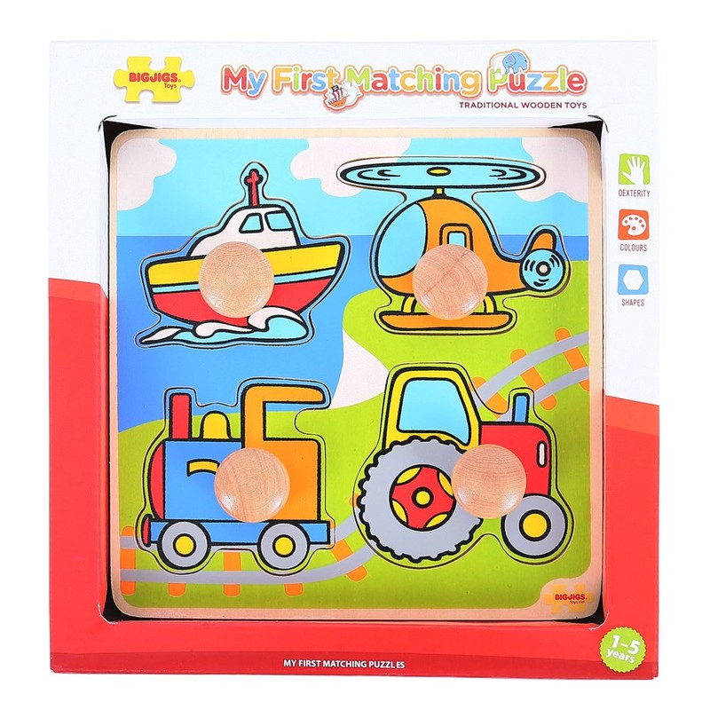 • TRANSPORT PEG PUZZLE - Match the four vehicles to the correct puzzle slot; features a boat, helicopter, tractor & train that are perfectly sized for little hands to lift, grasp and place - 1 year +
