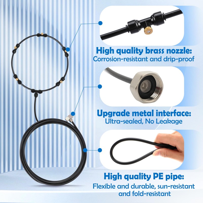 - 3 Sizes Durable Misting Line: 19/26/32ft misting line is optional, and it is easy to cope with different distances and scene requirements. It is made of high-quality polyethylene material to ensure corrosion resistance, explosion resistance, and leak resistance.