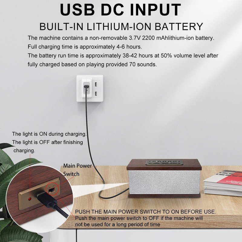 ***Note the main power ON/OFF switch on the back of the noise machine : Push the main power switch to ON before use.Push it to OFF if the machine is not used for a long time.